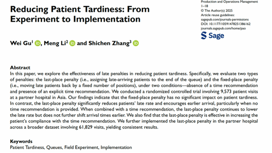 近日,女同av 女同av 系统工程研究所张世晨副教授作为通讯作者/共同一作的论文《Reducing Patient Tardiness: From Experiment to Implementation》在运营管理领域的国际顶级期刊Production & Operations Management在线发表。