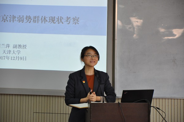 研讨会由张俊艳主持。在研讨会中,傅利平做了题为“天津市人口结构与生存状态分析”的报告,总体上介绍了2017年天津地区调查开展的总体安排和进度,同时从人口结构、户口、住房、教育、婚姻与生育、工资收入等8个维度全面展示了调查数据结果;吴晶则以“健康问题”为切入点,做了题为“时代变迁视角下天津市居民健康状况分析”的报告,分享了京津地区未成年人(16岁以下)和成年人自评健康和客观健康状况等方面的多维度分析结果;何兰萍的“基于均衡发展的京津弱势群体现状考察”报告,则从未成年人、妇女、老年人和外来人口四个角度对京津弱势群体的留守、教育、婚姻等问题进行了深入的分析。